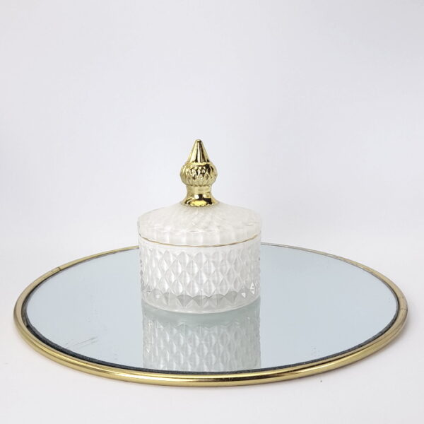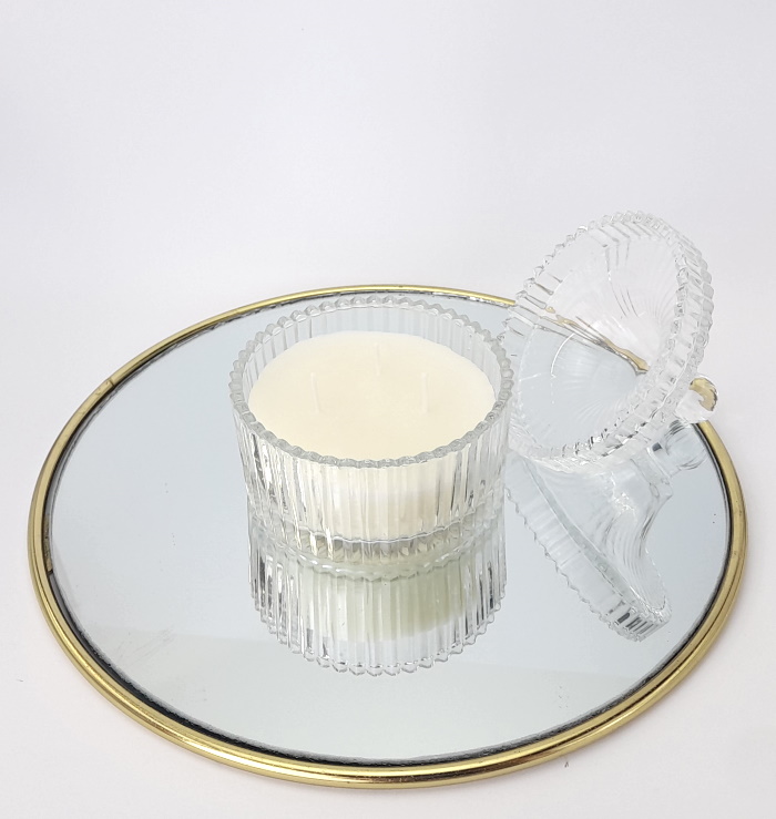 Aρωματικό κερί σε γυάλινη φοντανιέρα, με τρία φυτίλια, ιδανικό για να προσφέρει ζεστή και χαλαρωτική ατμόσφαιρα στο χώρο σας.