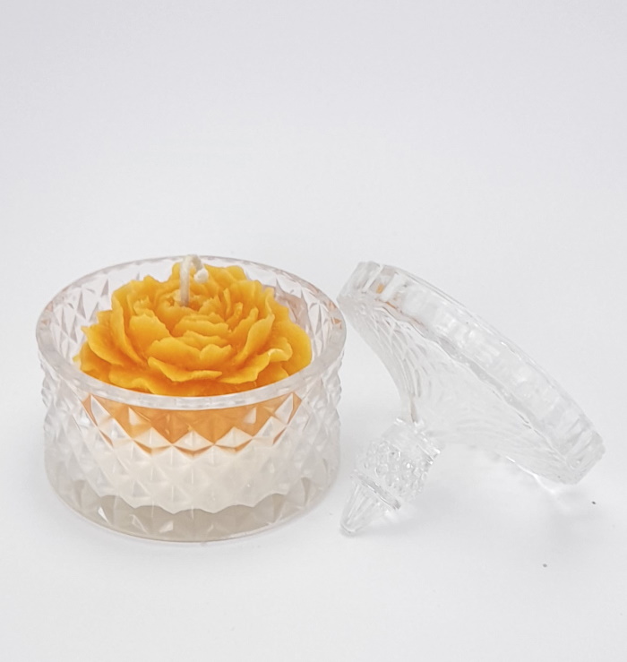 Aρωματικό κερί σε γυάλινη φοντανιέρα, με πορτοκαλί λουλούδι, ιδανικό για να προσφέρει ζεστή και χαλαρωτική ατμόσφαιρα στο χώρο σας.