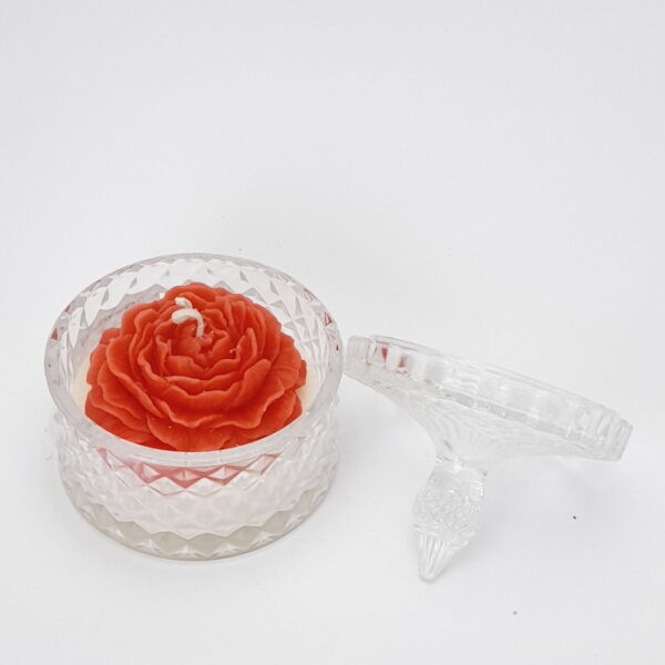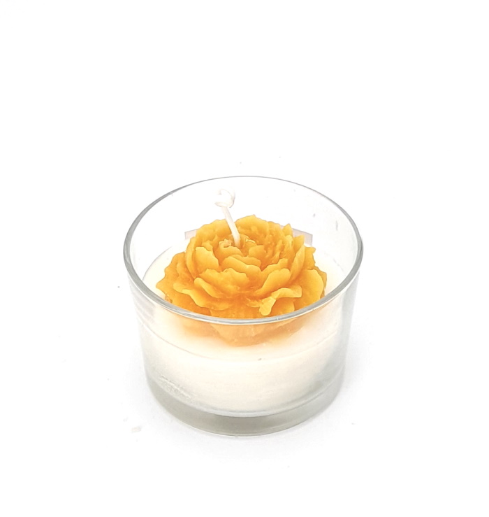Aρωματικό κερί σε γυάλινο ποτήρι, με πορτοκαλί λουλούδι, ιδανικό για να προσφέρει ζεστή και χαλαρωτική ατμόσφαιρα στο χώρο σας.