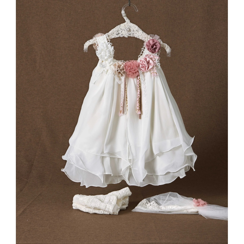 Φορεματάκι εκρού μουσελίνα με μύτες και σειρά από λουλούδια