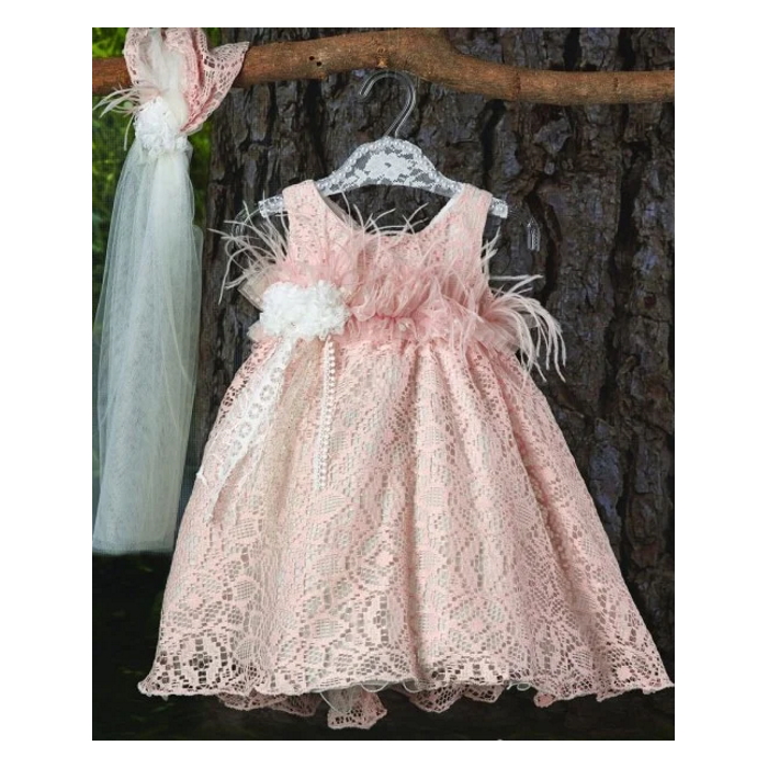 Φορεματάκι σομόν με δαντέλα και φτερό