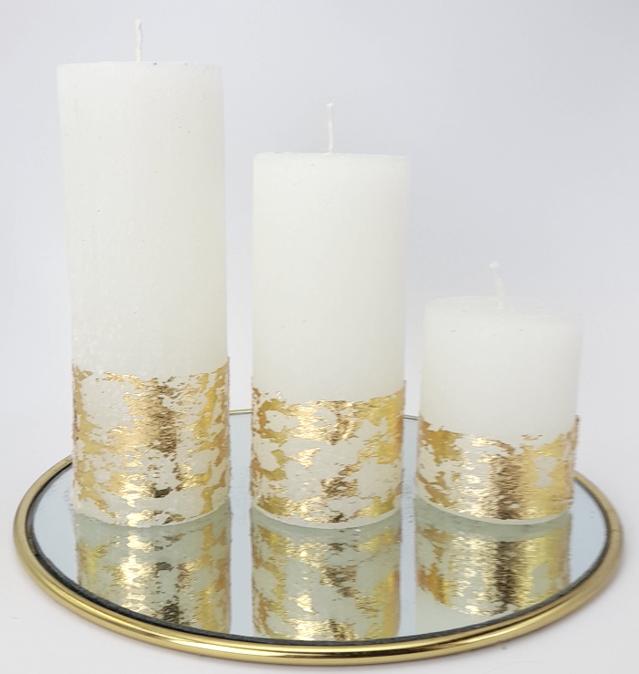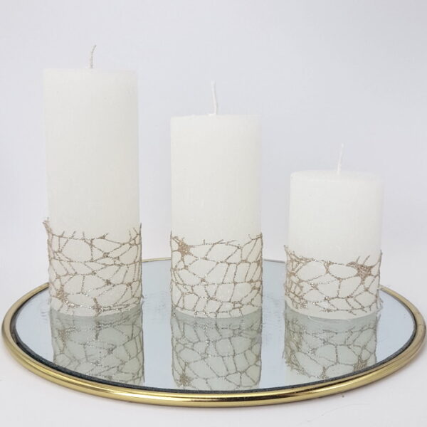 Κεριά Διακοσμημένα Σετ των Τριών, ιδανικά για διακόσμηση με γιορτινή ατμόσφαιρα.