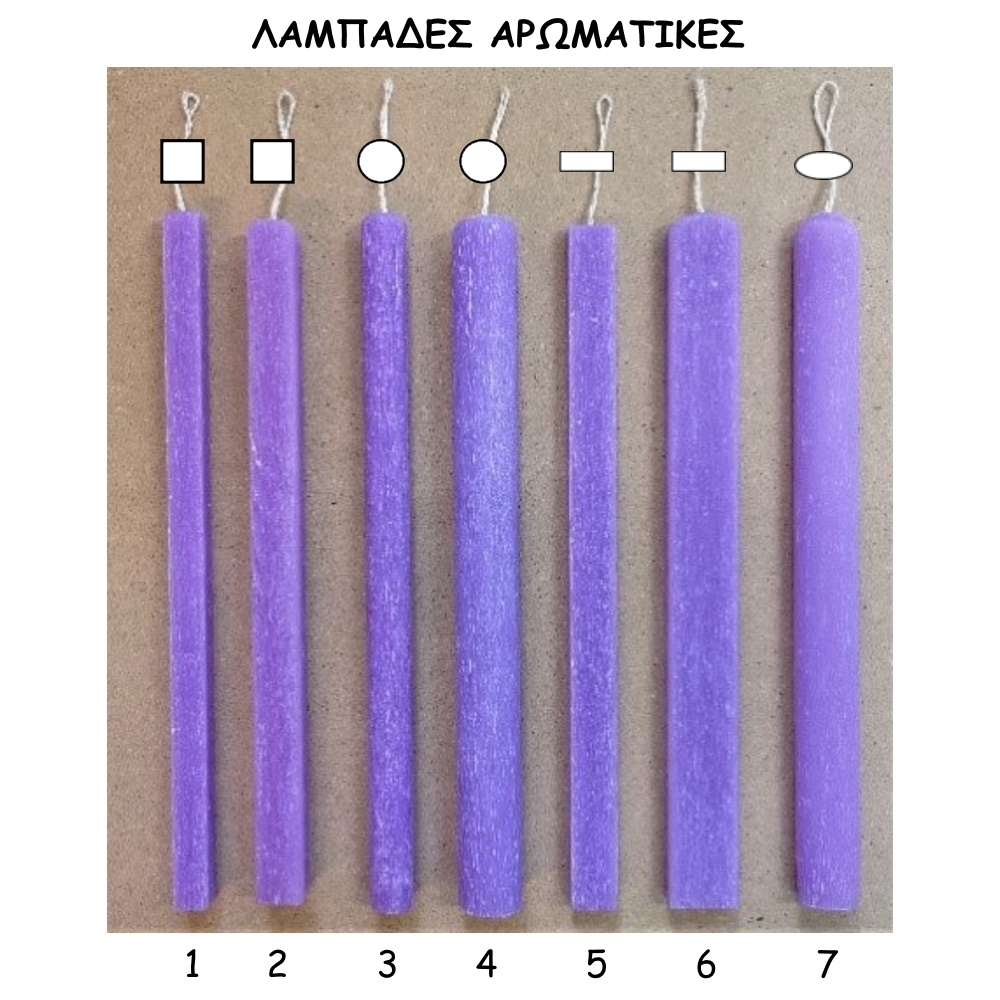Πασχαλινές Λαμπάδες Αρωματικές Γραμμωτές Χειροποίητες σε 7 διαφορετικές διαστάσεις και 11 χρώματα που συνδιάζονται με το αντίστοιχο άρωμα.